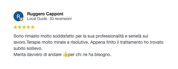 Professionista molto competente e umano. Mi ha risolto un'importante contrattura lombare, da subito ho sentito sollievo.